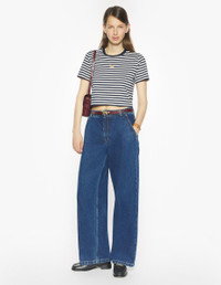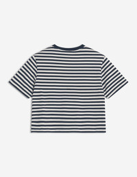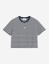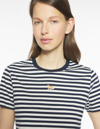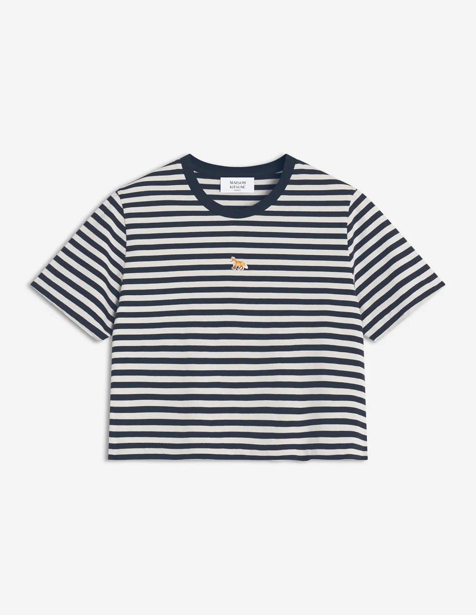 DETAILS Short-sleeve cotton jersey (180g) striped T-shirt. Cropped fit with Baby Fox embroidered patch. - Cotton jersey (180g) striped T-shirt - Organic cotton - Fitted cropped fit - Short sleeves - Crew neck with rib finishing - Baby Fox embroidered patch on the chest PW00118KJ7026-0392 SIZE & CUT Cut: CROPPED Sizing: WOMEN The female model is 5.7 and is wearing size S MATERIAL 100% COTTON TRACEABILITY Made in Portugal