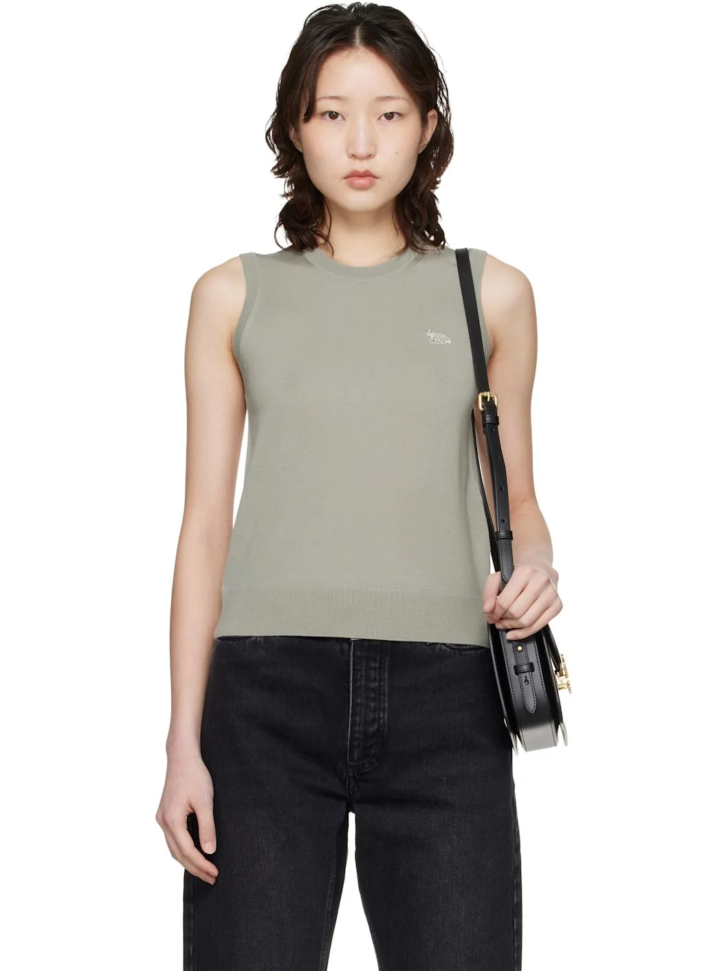 Knit merino wool sweater vest. · Rib-knit crewneck, hem, and armscyes · Embroidered logo patch at chest Supplier color: Tea leaf 100% wool. Made in Portugal 261389F096002