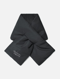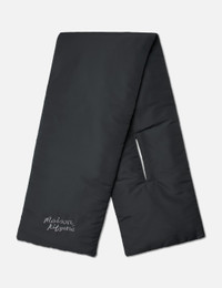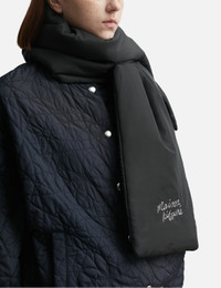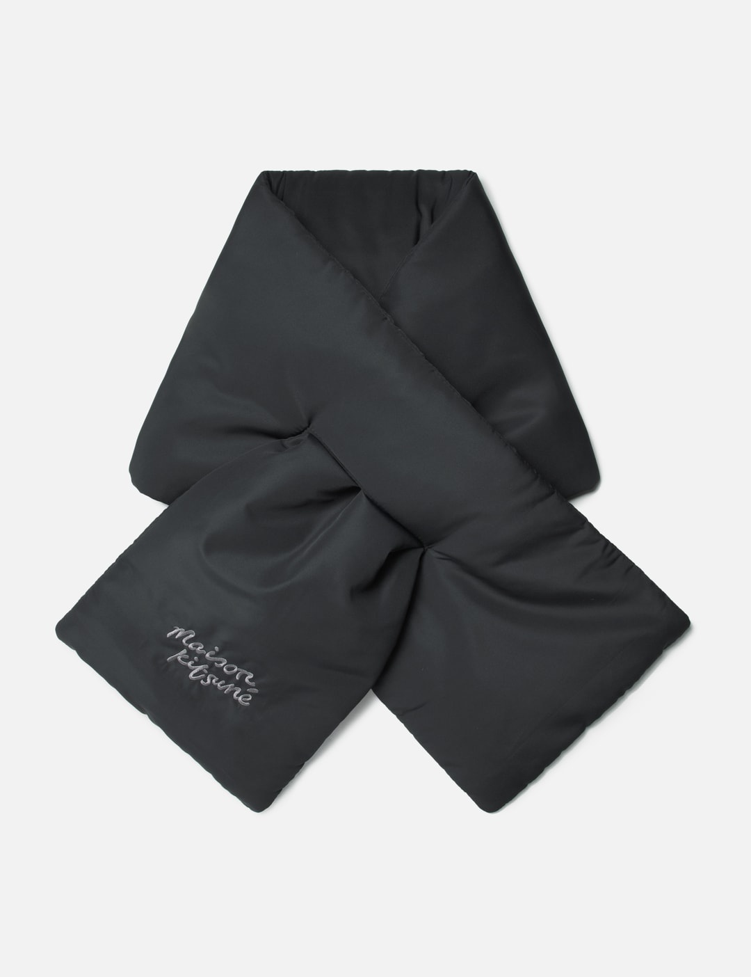 - Maison Kitsune - Puffer Scarf - Puffed nylon scarf - Silicon "Maison Kitsune Handwriting" logo at front - Color: Black - Material: 100% Polyamide - See more Scarves and Accessories SIZING Approximate measurement: - 26 x 137cm