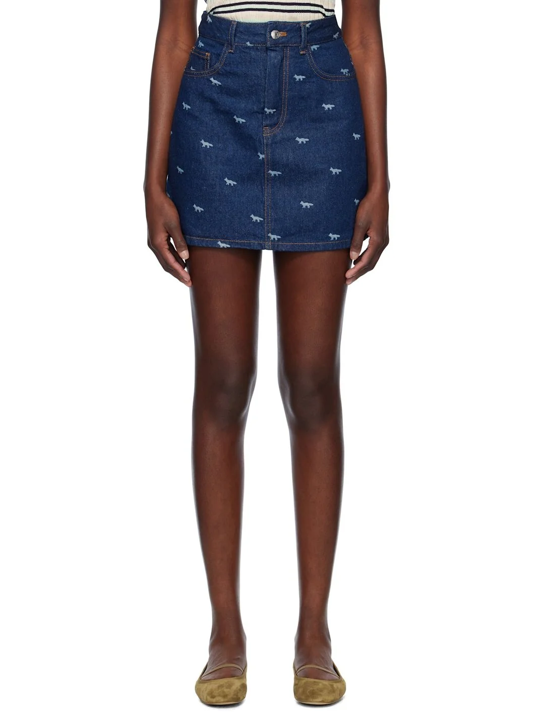Non-stretch denim miniskirt. Logo pattern laser-printed throughout. · Belt loops · Five-pocket styling · Zip fly · Logo patch at back waistband · Contrast stitching in tan Supplier color: Dark laser profile fox Body: 100% cotton. Lining: 80% polyester, 20% cotton. Made in Tunisia 251389F090001