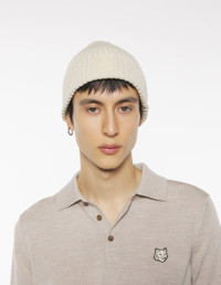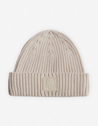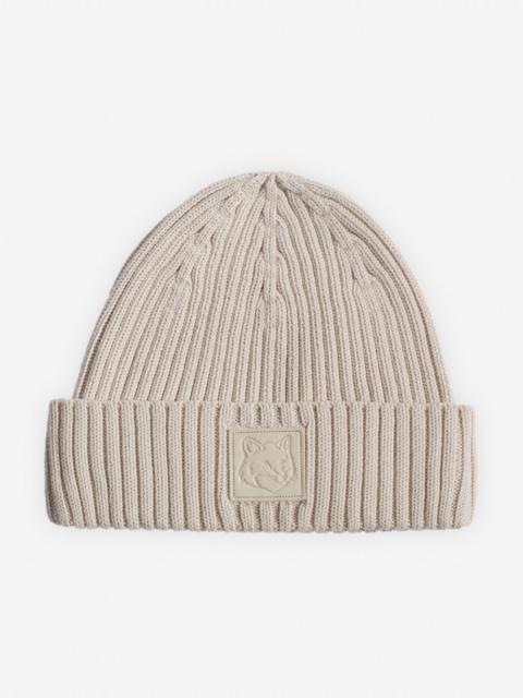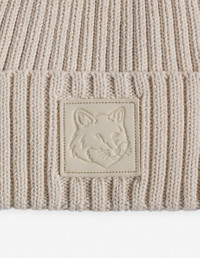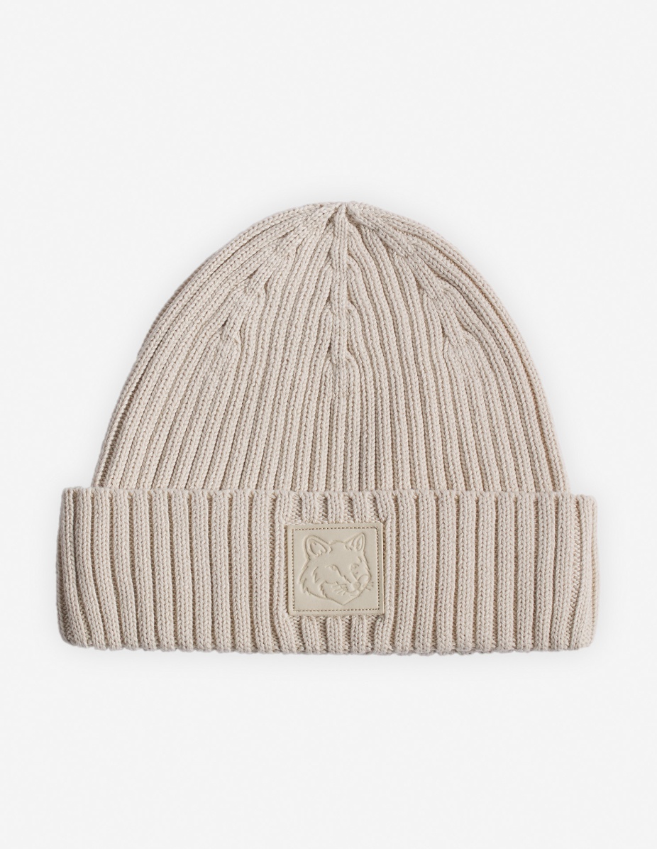 DETAILS Cotton beanie with Bold Fox Head embossed leather patch. - Plain ribbed cotton knit beanie - Tone-on-tone Bold Fox Head embossed leather patch on the cuff OW06110KT1140-P205 SIZE & CUT Sizing: WOMEN MATERIAL 100% COTTON TRACEABILITY Made in Morocco