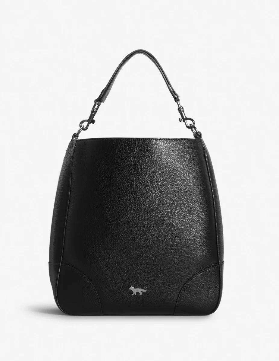 DETAILS Hobo Boogie bag in grained leather. - Hobo bag in grained leather - Handheld and shoulder wear - Removable shoulder strap with carabiner hooks - Topstitched leather panels - Metal Profile Fox and rivets - Silver embossed Maison Kitsune Paris logo at the back - Snap closure - Lining and interior pocket in twill - Jacron with Maison Kitsune logo on the interior pocket - Dimensions: 34 x 32 x 13 cm OW05135LR0024-P199 SIZE & CUT Sizing: WOMEN MATERIAL Exterior: 100% BOVINE LEATHER, Interior: 100% COTTON TRACEABILITY Made in Morocco