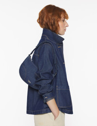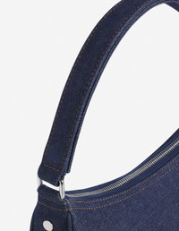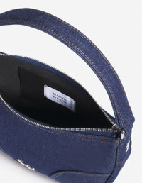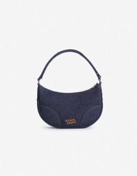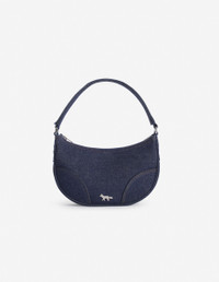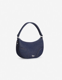 DETAILS Half-moon Boogie bag in Japanese denim. - Half-moon bag in Japanese denim - Handheld, shoulder, and crossbody wear - Adjustable shoulder strap with snap - Topstitched denim panels - Metal Profile Fox and rivets - Maison Kitsune Handwriting signature embroidered at the back - Zipper closure, engraved Profile Fox slider - Lining and interior pocket in twill - Woven label with Maison Kitsune Paris logo on the interior pocket - Dimensions: 17 x 27 x 8 cm OW05137WW0081-P470 SIZE & CUT Sizing: WOMEN MATERIAL Exterior: 100% COTTON, Interior: 100% COTTON TRACEABILITY Made in Morocco