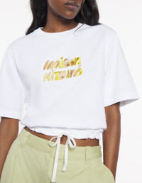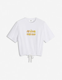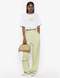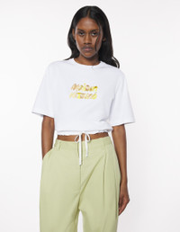 DETAILS Short sleeve cotton tee-shirt. Boxy cut with embroidered Bubble Logo. - Plain cotton tee-shirt - Boxy cut - Rib-knit trim crewneck - Bubble Logo embroidered at the front - Short sleeves - Drawstring waist OW00120KJ0119-P100 SIZE & CUT Cut: BOXY Sizing: WOMEN The female model is 9.1 and is wearing size S MATERIAL 100% COTTON TRACEABILITY Made in Portugal