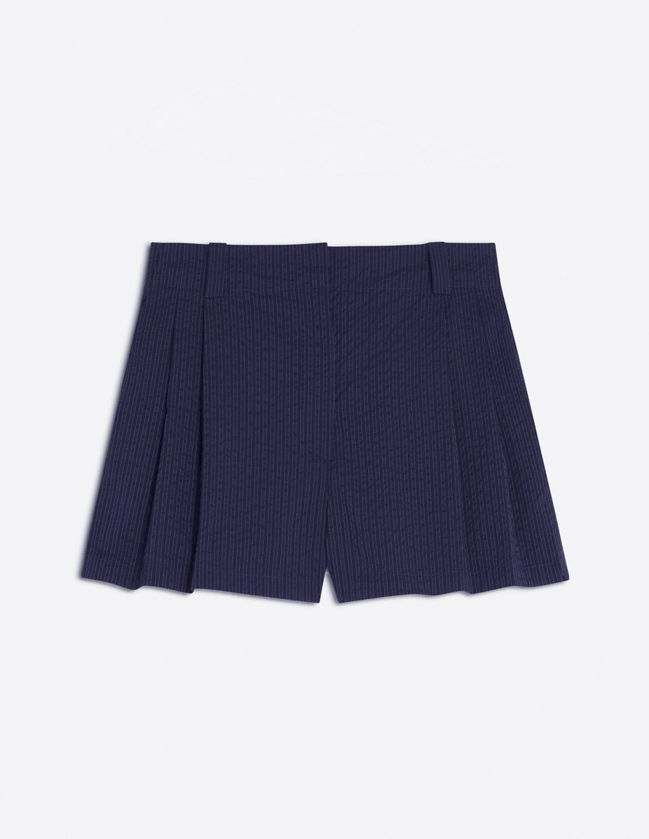 DETAILS Pleated shorts in striped seersucker. Relaxed cut with Maison Kitsune Handwriting signature woven label. - Pleated casual shorts in striped seersucker - Relaxed cut - Waistband with belt loops and elasticated back - Hook-and-eye closure with hidden zipper - Double pleats at the front - Two side slash pockets - Two patch back pockets - Maison Kitsune Handwriting signature woven label appliqueee at the back OW01120WC5032-P480 SIZE & CUT Cut: RELAXED Sizing: WOMEN MATERIAL Main Material: 26% COTTON, 74% POLYESTER, Pocket lining: 49% COTTON, 51% VISCOSE TRACEABILITY Made in Portugal