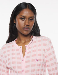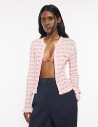 DETAILS Rib-knit cardigan with checks. Fitted cut with embroidered Baby Fox patch. - Jacquard rib-knit cardigan with check motifs - Fitted cut - Crewneck - Engraved button closure - Tone-on-tone Baby Fox patch embroidered on the chest - Long sleeves - Gathered trim at the cuffs and waist OW00503KT1120-0139 SIZE & CUT Cut: FITTED Sizing: WOMEN The female model is 9.1 and is wearing size S MATERIAL 100% COTTON TRACEABILITY Made in Portugal