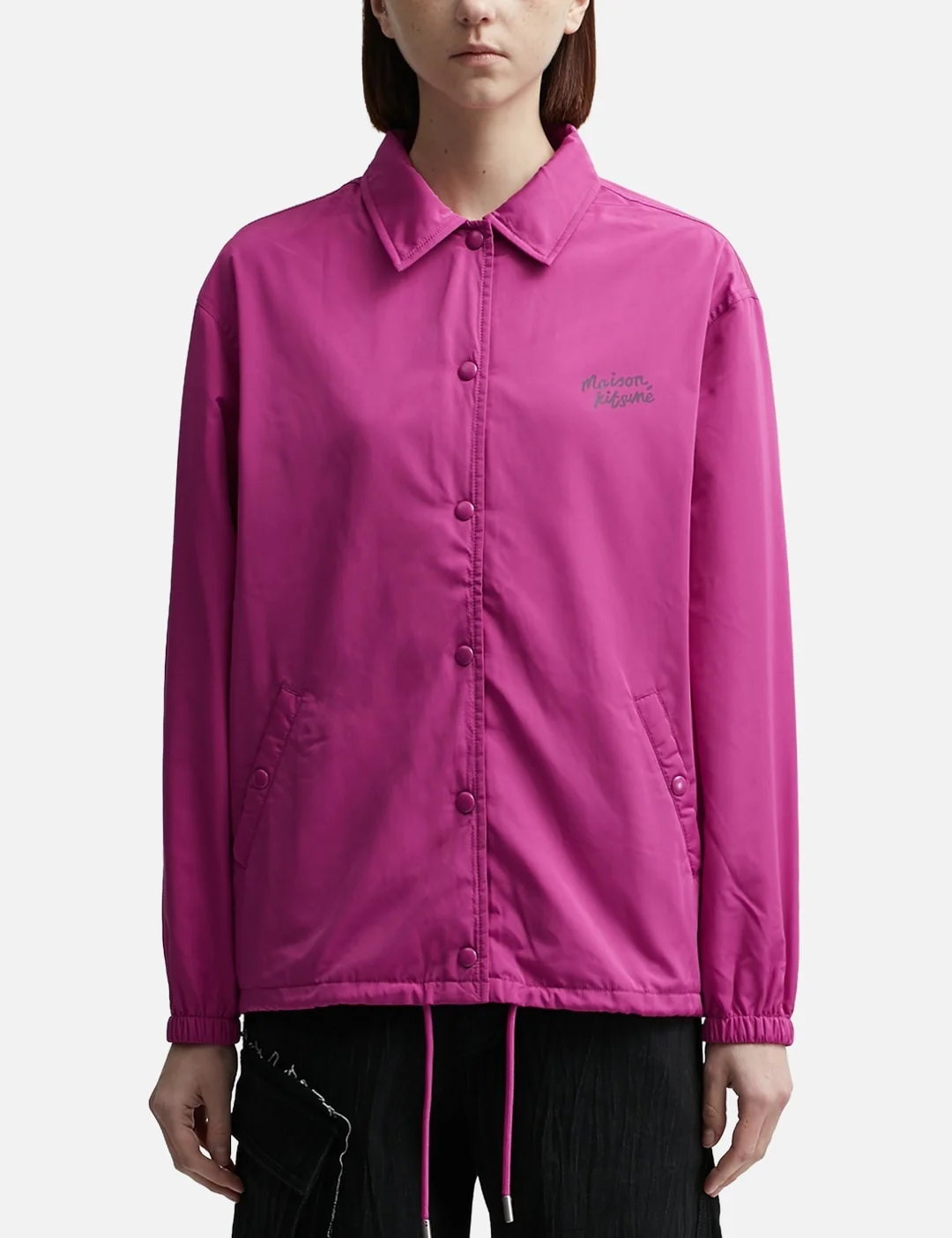 - Maison Kitsuné - Coach Jacket - Shirt collar - Button closure - Logo print at chest - Elasticated cuffs - Drawstring hem - Color: Fuchsia - Material: Nylon - See more Jackets and Clothing SIZING - Model wears size S - Model measures: Height 172cm, Chest 32”/81cm, Waist 23’’/58.42cm, Hip 87.63/cm