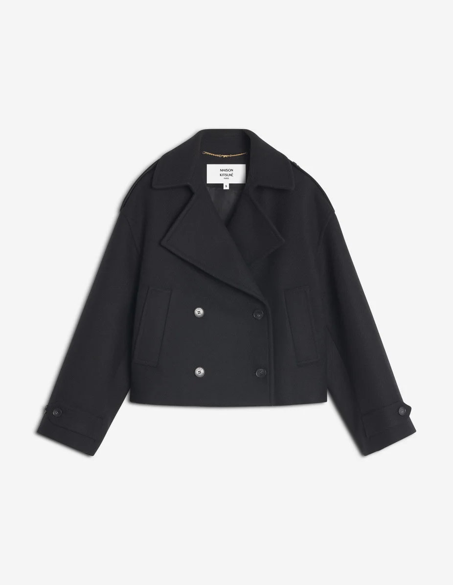 DETAILS Cropped recycled wool peacoat. - Cropped recycled wool peacoat - Cropped fit - Double-breasted button closure - Two welt pockets - Shoulder and cuff buttoned tabs - Profile Fox chain at the inner neckline PW02219WM2030-P199 SIZE & CUT Cut: LONG Sizing: WOMEN The female model is 5.7 and is wearing size S MATERIAL Main Material: 100% WOOL, Lining: 49% COTTON, 51% VISCOSE TRACEABILITY Made in Bulgaria