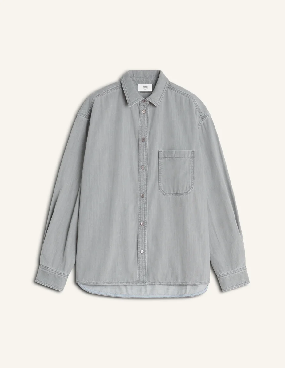 DETAILS Boyfriend shirt in light denim. Comfort fit with Maison Kitsune Paris engraved metal rivet at the back. - Lightweight denim shirt in a grey wash - Comfort fit - Classic collar - American button placket with Maison Kitsune engraved buttons - Patch chest pocket - Maison Kitsune Paris engraved metal rivet at the back QW02103WD4028-0488 SIZE & CUT Cut: COMFORT Sizing: WOMEN The female model is 5.7 tall and wears a size S MATERIAL 100% COTTON TRACEABILITY Made in Italy