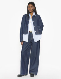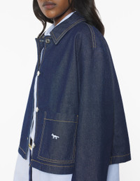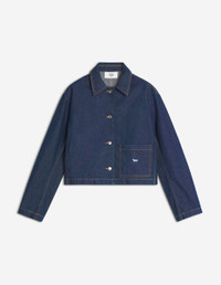 DETAILS Cropped Japanese denim jacket. Profile Fox embroidery and contrasted topstitching. - Cropped Japanese denim jacket - Cropped fit - Shirt collar - Patch pocket on the bottom left with Profile Fox embroidery - Maison Kitsune engraved metal button fastening - Contrasting topstitching and shirt collar PW02142WW0081-P470 SIZE & CUT Cut: CROPPED Sizing: WOMEN The female model is 5.7 and is wearing size S MATERIAL 100% COTTON TRACEABILITY Made in Italy