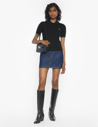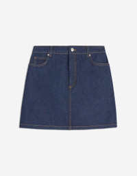 DETAILS Japanese denim mini skirt. Five-pocket design with Maison Kitsune Handwriting embossed jacron. - Japanese denim skirt - Mini length - Fixed waistband with belt loops - Engraved metal button closure and zip fly under placket - Five-pocket styling - Embossed leather jacron with Maison Kitsune Handwriting signature at the back PW01503WW0081-P470 SIZE & CUT Cut: MINI Sizing: WOMEN The female model is 5.7and is wearing size 26 MATERIAL Main Material: 100% COTTON, Pocket lining: 35% COTTON, 65% POLYESTER TRACEABILITY Made in Italy