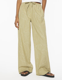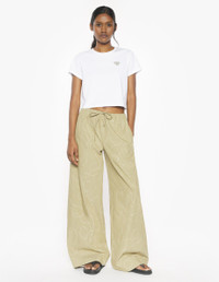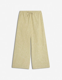 DETAILS Wide pants in light chambray with Maison Kitsune Handwriting embroidery and side pockets. - Wide-leg pants in light chambray - Wide fit - Side pockets - Drawstring - Maison Kitsune Handwriting embroidery on the back pocket SPOW142WC5043-P357 SIZE & CUT Cut: RELAXED Sizing: WOMEN The female model is 5 and is wearing size S MATERIAL 100% COTTON TRACEABILITY Made in Portugal