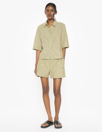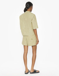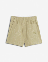 DETAILS Light cotton chambray pleated shorts with Maison Kitsune Handwriting embroidery. - "Desa Design" Embroidered Pleated Shorts in light chambray - Slanted side pockets - Maison Kitsune Bali Handwriting embroidery on the back pocket - Casual pleats - Embroideries throughout SPOW141WC5043-P357 SIZE & CUT Sizing: WOMEN The female model is 5 and is wearing size S MATERIAL 100% COTTON TRACEABILITY Made in Portugal