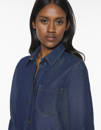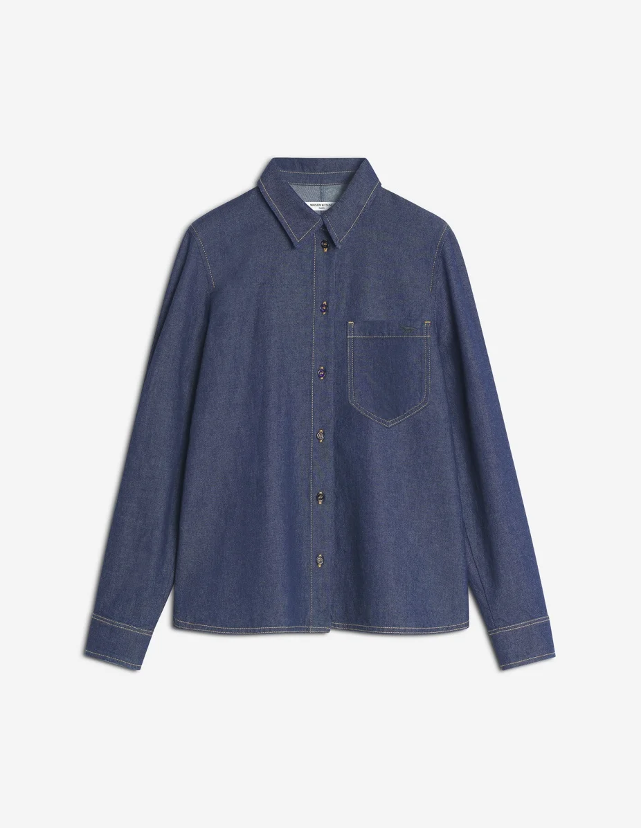 DETAILS Light Japanese denim shirt, comfort fit, contrasted topstitching. - Lightweight Japanese denim shirt - Comfort fit - Col classique - Long sleeves finished with straight buttoned cuffs - Maison Kitsune engraved button closure - Contrasted topstitching and hybrid armhole: set-in sleeves at the front and raglan at the back highlighting the shoulder line - Patch chest pocket PW00414WD4016-P470 SIZE & CUT Cut: COMFORT Sizing: WOMEN The female model is 36 and is wearing size S MATERIAL 100% COTTON TRACEABILITY Made in Italy