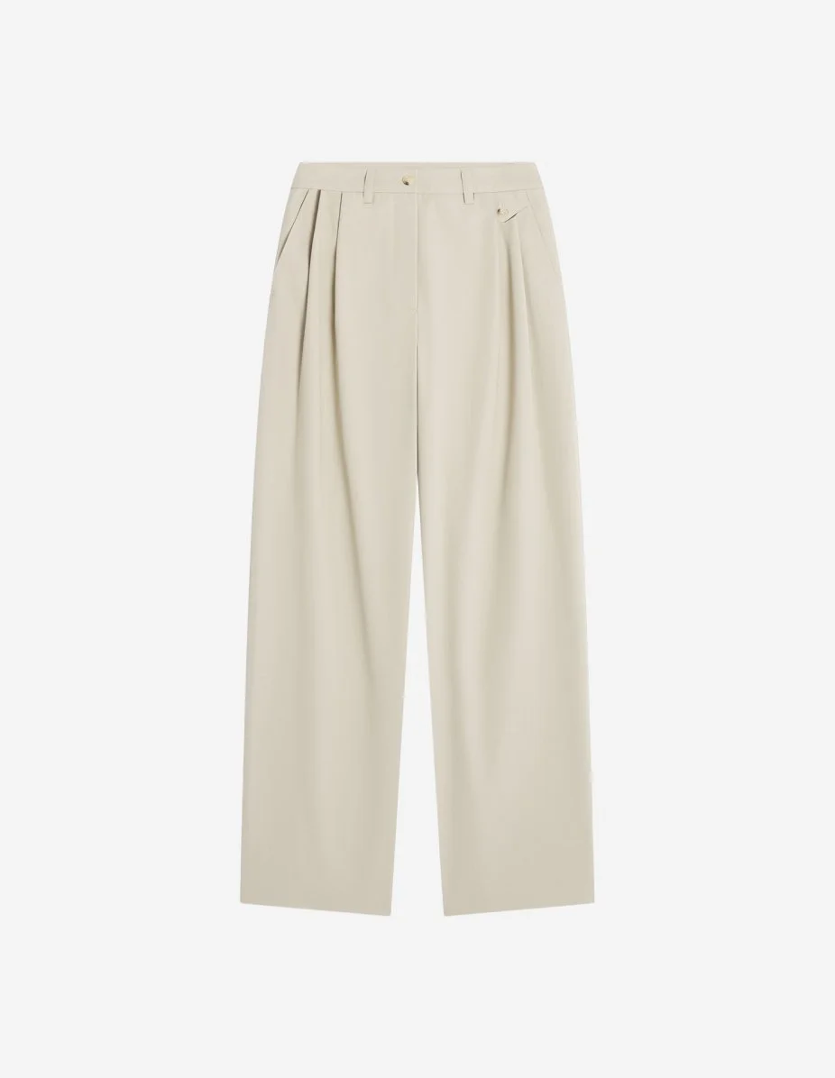 DETAILS Cotton twill trousers with double pleats. - High-twist cotton twill trousers - Comfort fit - Set-on waistband with belt loops - Button closure with zip fly under placket - Double front pleats - Two side slant pockets - Buttoned flap pocket at the front - Two welt pockets at the back PW01106WT3019-0335 SIZE & CUT Cut: COMFORT Sizing: WOMEN The female model is 5.7 and is wearing size 36 MATERIAL Main Material: 100% COTTON, Pocket lining: 100% COTTON TRACEABILITY Made in Portugal