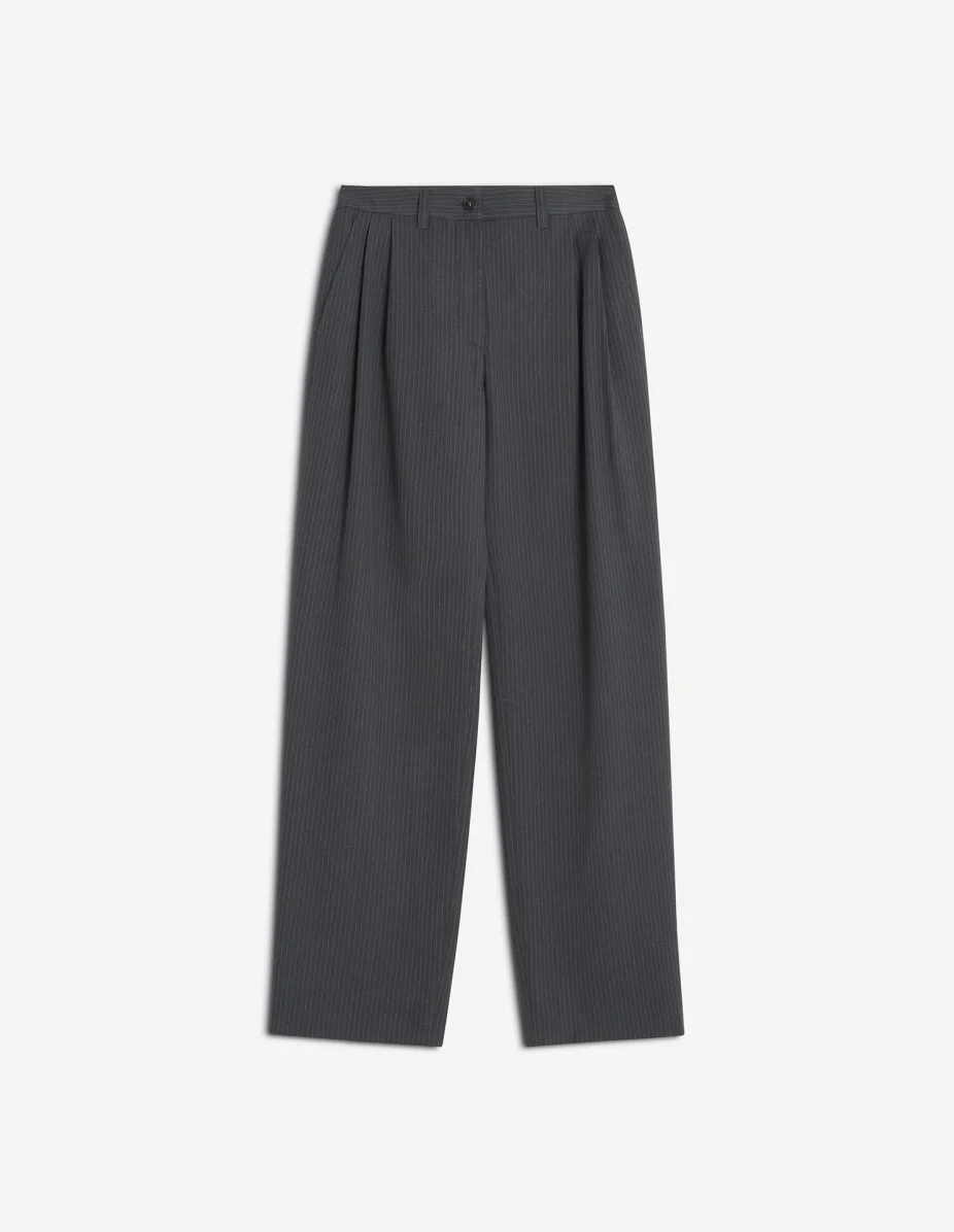 DETAILS Double-pleated pinstripes cotton and wool pants. - Double-pleated trousers in a cotton and virgin wool blend with fine stripes - Comfort fit - Waistband with belt loops - Button closure with hidden zip fly under placket - Double front pleats - Two side slant pockets - Two back welt pockets - Fox Column woven label at the waistband PW01126WT3022-H170 SIZE & CUT Cut: COMFORT Sizing: WOMEN The female model is 5.7 and is wearing size 36 MATERIAL Main Material: 74% COTTON, 2% POLYESTER, 24% WOOL, Pocket lining: 49% COTTON, 51% VISCOSE TRACEABILITY Made in Romania