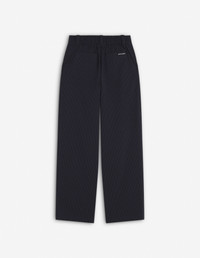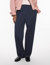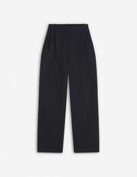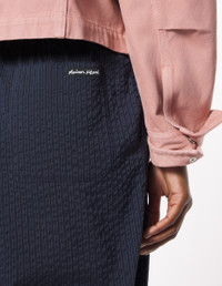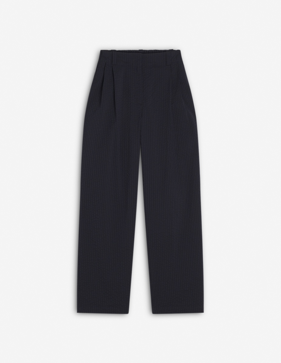 DETAILS Pleated pants in striped seersucker. Relaxed cut with Maison Kitsune Handwriting signature woven label. - Pleated casual pants in striped seersucker - Relaxed cut - Waistband with belt loops and elasticated back - Hook-and-eye closure with hidden zipper - Double pleats at the front - Two side slash pockets - Two patch back pockets - Maison Kitsune Handwriting signature woven label appliqueee at the back OW01104WC5032-P480 SIZE & CUT Cut: RELAXED Sizing: WOMEN The female model is 9.1 and is wearing size S MATERIAL Main Material: 26% COTTON, 74% POLYESTER, Pocket lining: 49% COTTON, 51% VISCOSE TRACEABILITY Made in Portugal