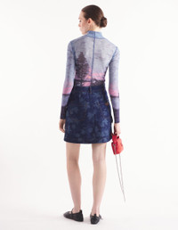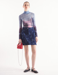 DETAILS Denim mini skirt with Falling Leaves laser print. Mini length with Profile Fox embroidered on the front pocket and "Maison Kitsune Handwriting" signature embroidery on the back pocket. - Denim mini skirt with laser print - Mini length - Belt loops at the waistband - Button closure with hidden zipper - Two slash front pockets - Two patch back pockets - All-over Falling Leaves laser motifs - Profile Fox embroidered on the front pocket - Embroidered "Maison Kitsune Handwriting" signature on the back pocket NW01519WW5023-0039 SIZE & CUT Cut: MINI Sizing: WOMEN The female model is 5.8 and is wearing size S MATERIAL 100% COTTON TRACEABILITY Made in Tunisia
