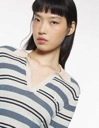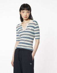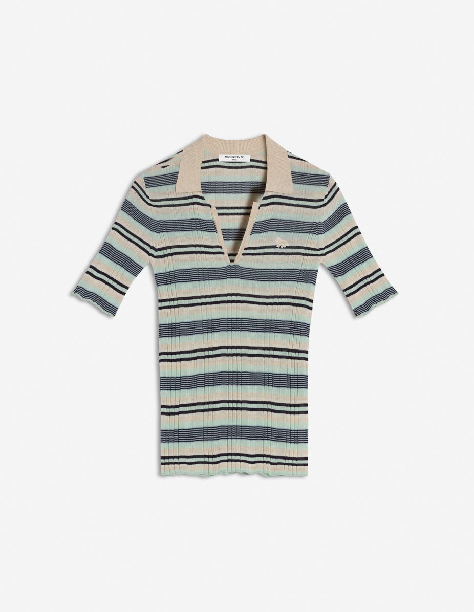 DETAILS Ribbed cotton polo shirt with stripes. Fitted cut with embroidered Baby Fox patch. - Ribbed cotton polo shirt with stripes - Fitted cut - Polo collar with ribbed trim - Embroidered Baby Fox patch on the chest - Short sleeves OW00203KT1122-0269 SIZE & CUT Cut: COMFORT Sizing: WOMEN The female model is 5 and is wearing size S MATERIAL 47% ACETATE, 53% COTTON TRACEABILITY Made in China