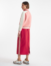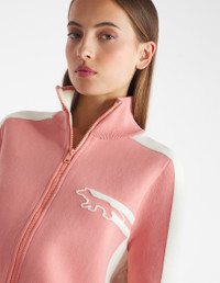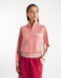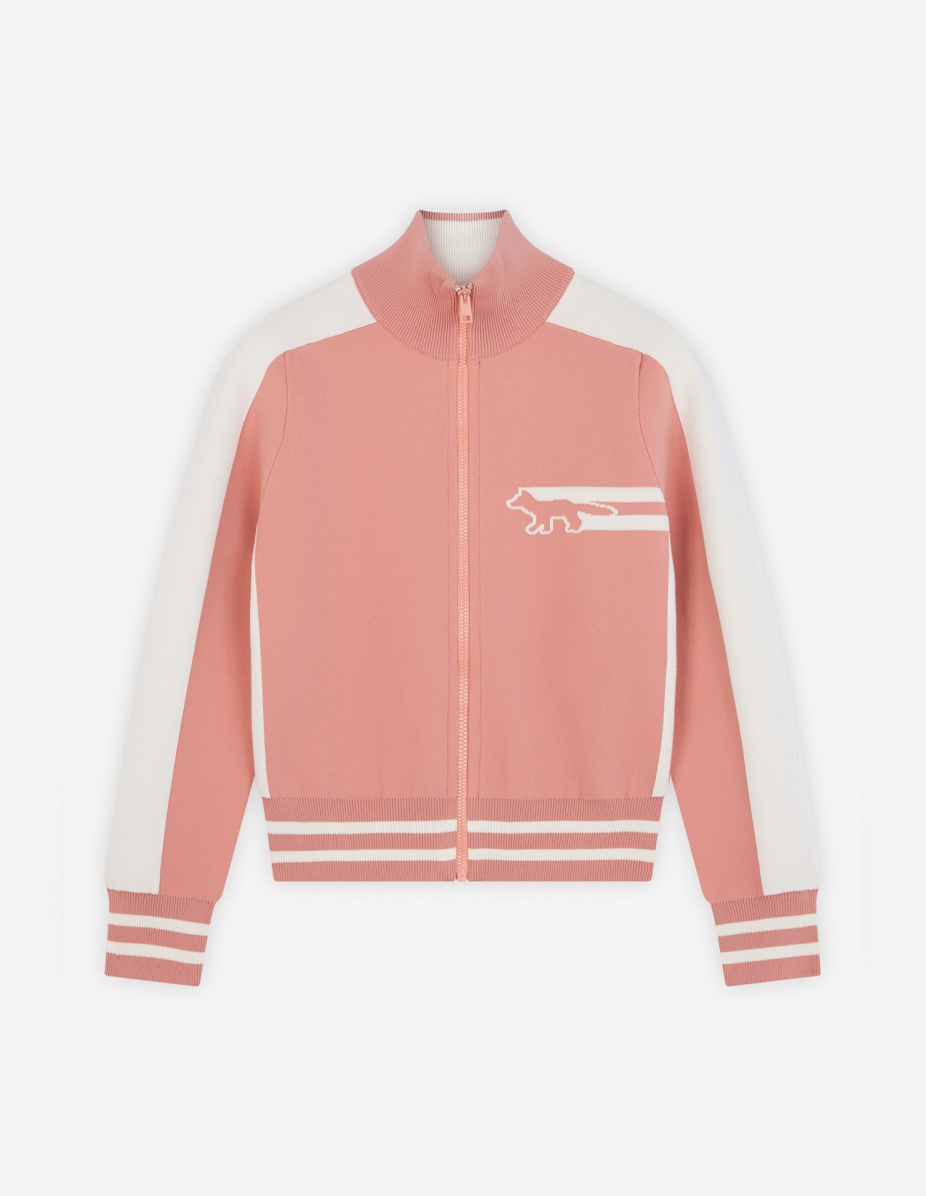 DETAILS Zipped technical knit cardigan with long sleeves. Regular fit with intarsia Flash Fox on the chest. - Bicolor technical knit cardigan - Regular fit - High collar - Apparent front zipper closure with Profile Fox engraved slider - Long sleeves - Ribbing at the neckline, cuffs, and waist - Contrast intarsia Flash Fox on the chest NW00502KM0327-P634 SIZE & CUT Sizing: WOMEN The female model is 5.7 and is wearing size S MATERIAL 55% COTTON, 45% POLYAMIDE TRACEABILITY Made in China