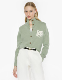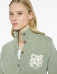 DETAILS Merino wool cardigan with high neck. Regular fit with Fox Head intarsia on the chest. - Merino wool cardigan with stand-up collar - Regular fit - Maison Kitsune engraved button closure - Long sleeves - Rib finishing at collar, cuffs and hem - Fox Head intarsia on the chest NW00509KM0329-0396 SIZE & CUT Cut: REGULAR Sizing: WOMEN The female model is 5.7 and is wearing size S MATERIAL 100% WOOL TRACEABILITY Made in China