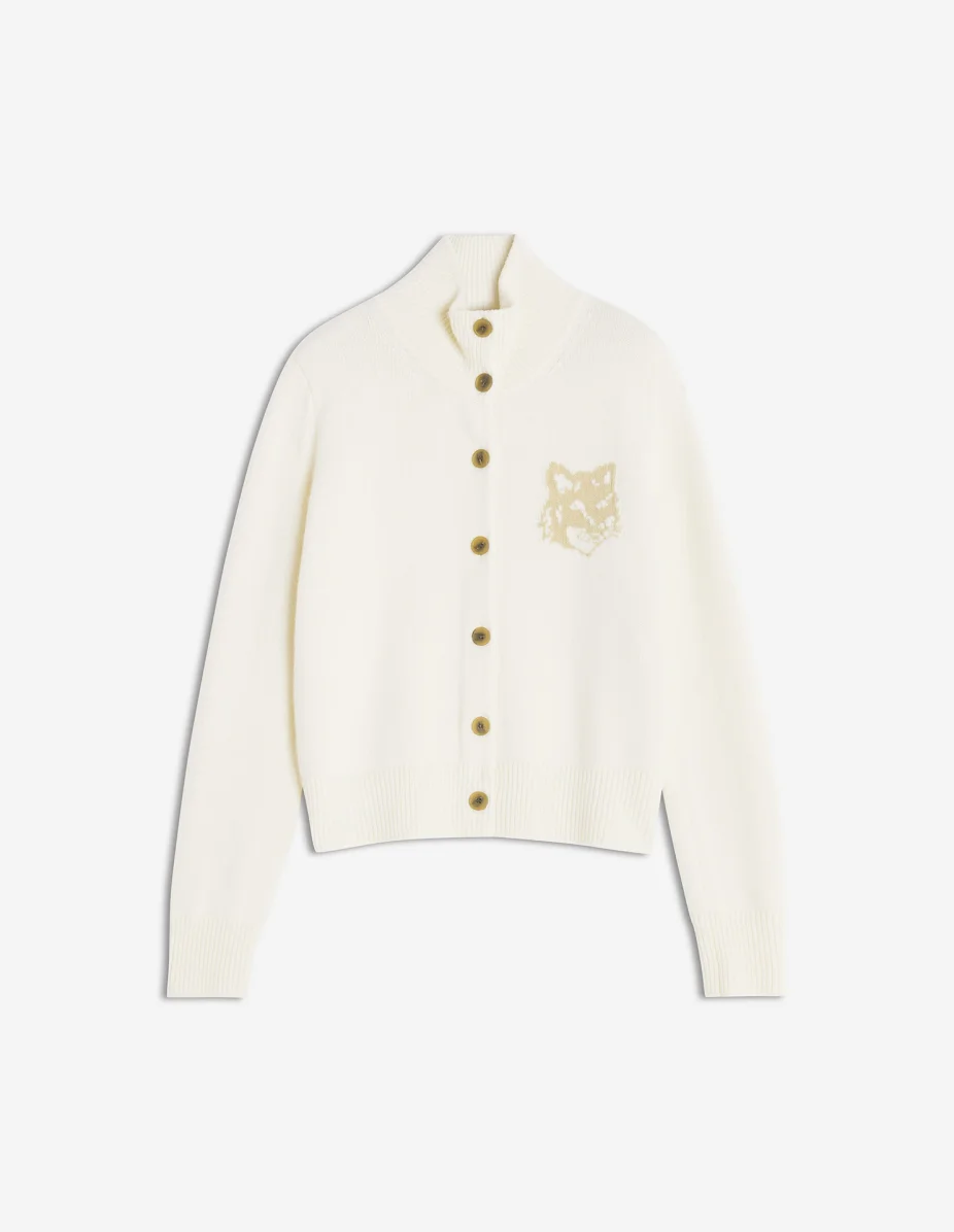 DETAILS Merino wool cardigan with high neck. Regular fit with Fox Head intarsia on the chest. - Merino wool cardigan with stand-up collar - Regular fit - Maison Kitsune engraved button closure - Long sleeves - Rib finishing at collar, cuffs and hem - Fox Head intarsia on the chest NW00509KM0329-0395 SIZE & CUT Cut: REGULAR Sizing: WOMEN The female model is 5.7 and is wearing size S MATERIAL 100% WOOL TRACEABILITY Made in China