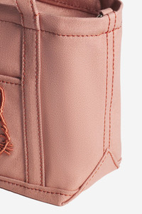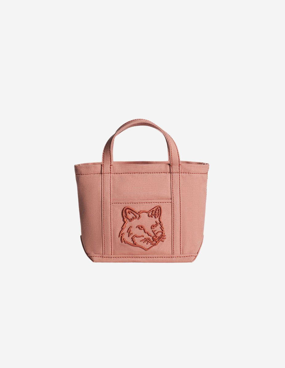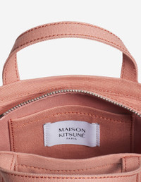 DETAILS Mini Fox Head tote bag in heavy coated canvas. - Mini tote bag in heavy plain coated canvas - Handheld, shoulder, and crossbody wear - Two small handles - Removable shoulder strap with engraved carabiner hooks and adjustable buckle - Front patch pocket with tone-on-tone Fox Head embroidery - Tone-on-tone Maison Kitsune Handwriting signature embroidered at the back - Zipper with engraved Profile Fox slider - Interior patch pocket with woven label with contrasted Maison Kitsune logo - Twill lining - Dimensions: 22 x 15 x 7.5 cm MW05106WW0107-0088 SIZE & CUT Sizing: UNISEX MATERIAL 100% COTTON TRACEABILITY Made in China