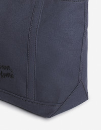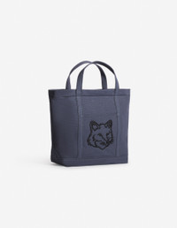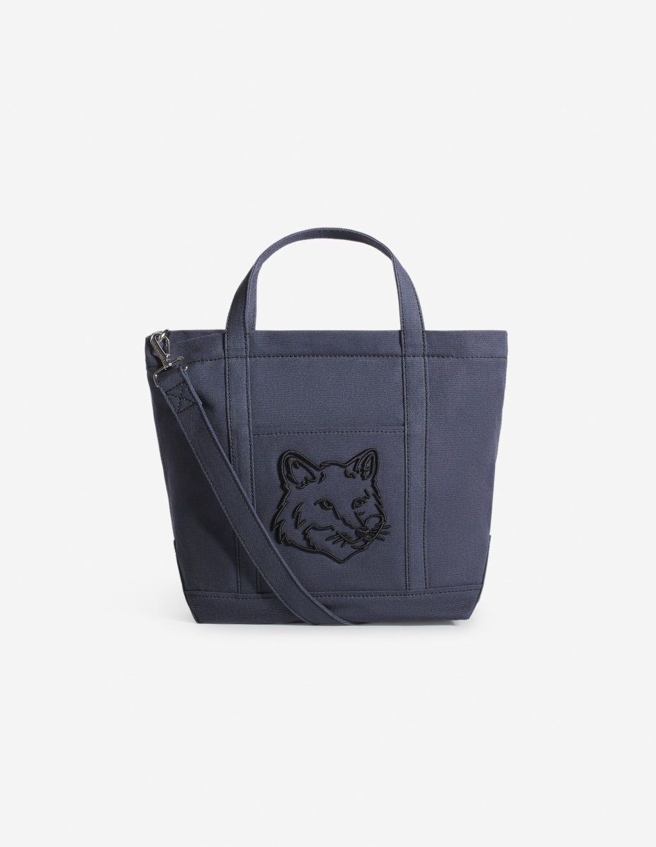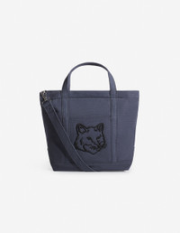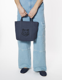DETAILS Small Fox Head tote bag in heavy coated canvas. - Small tote bag in heavy plain coated canvas - Handheld, shoulder, and crossbody wear - Two small handles - Removable shoulder strap with engraved carabiner hooks and adjustable buckle - Front patch pocket with tone-on-tone Fox Head embroidery - Tone-on-tone Maison Kitsune Handwriting signature embroidered at the back - Zipper with engraved Profile Fox slider - Interior patch pocket with woven label with contrasted Maison Kitsune logo - Twill lining - Dimensions: 33 x 25.5 x 12 cm LW05103WW0107-0076 SIZE & CUT Sizing: UNISEX MATERIAL Exterior: 100% COTTON, Interior: 100% COTTON TRACEABILITY Made in China