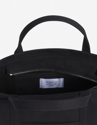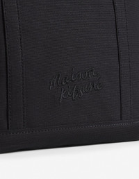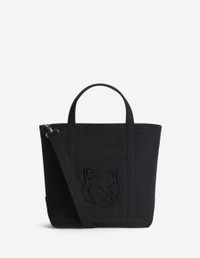 DETAILS Fox Head Small Tote in heavy coated canvas - Small tote bag in heavy coated canvas - Hand, shoulder or cross-body carry - Two small handles - Detachable and adjustable strap with engraved clasps and buckle - Front patch pocket with tonal Fox Head embroidery - Tonal Maison Kitsune Handwriting signature embroidered on the back - Zip fastening with engraved Profile fox puller - Internal patch pocket - Cotton lining - Dimensions: 22 x 15 x 7.5 cm LW05103WW0107-P199 SIZE & CUT Sizing: UNISEX MATERIAL Exterior: 100% COTTON, Interior: 100% COTTON TRACEABILITY Made in China