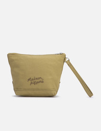 - Maison Kitsune - Fox Head Zipped Pouch - Embroidered Fox Head at front - Zip closure - Main compartment with one interior pocket - "Maison Kitsune Handwriting" embroidery at rear - Color: Chestnut - Material: 100% Cotton - See more Bags and Accessories SIZING Approximate dimensions: - Height: 18cm - Width: 24cm - Depth: 10cm - Handle Length: 17cm