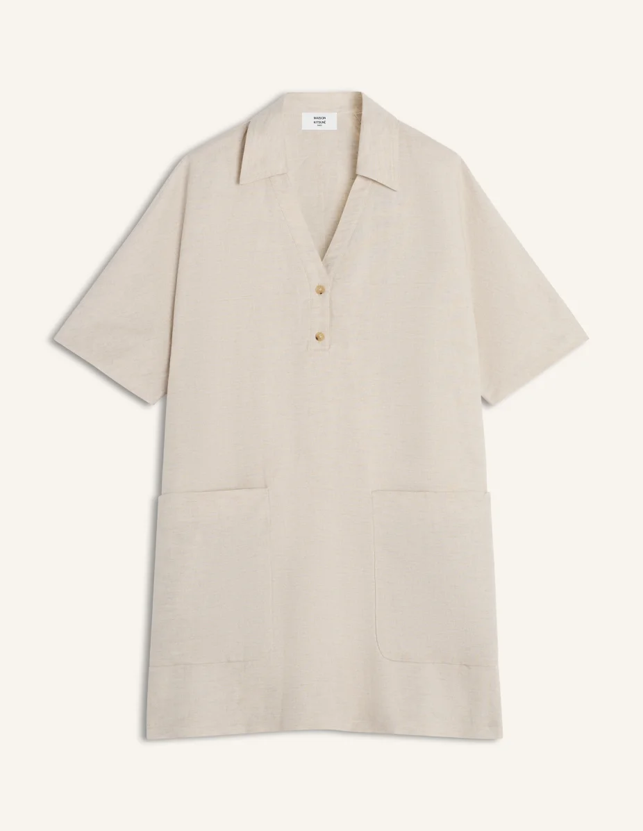 DETAILS Polo mini dress in cotton-linen blend toile. Maison Kitsune Paris engraved metal rivet at the back neckline. - Cotton linen blend polo dress - Polo open neckline - Button placket closure - Short sleeves - Patch pocket on the front - Maison Kitsune Paris engraved metal rivet at the back neckline QW01602WW9083-0432 SIZE & CUT Sizing: WOMEN The female model is 5.7 tall and wears a size S MATERIAL Main Material: 55% COTTON, 45% LINEN, Pocket lining: 100% COTTON TRACEABILITY Made in Bulgaria