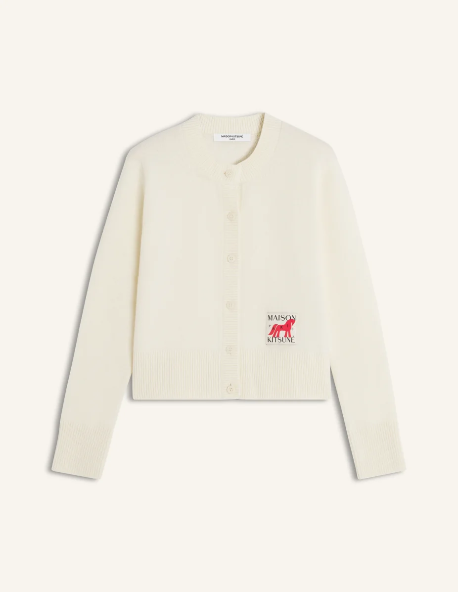 DETAILS Cardigan in lambswool. Fitted cut with Year of the Horse woven label at the bottom left. - Lambswool cardigan - Fitted cut - Crew neck - Button closure with Maison Kitsune engraved buttons - Ribbing at the neckline, cuffs, and bottom - Year of the Horse woven label at the bottom left QW050CLKT1006-0383 SIZE & CUT Cut: FITTED Sizing: WOMEN The female model is 5 tall and wears a size S MATERIAL 100% WOOL TRACEABILITY Made in Morocco