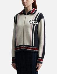 - Maison Kitsune - Knitted College Blouson - Soft knit wool cardigan - Visible front zipper closure with Profile Fox engraved slider - Contrasting striped ribbings on collar, cuffs and hem - Embroidered "Maison Kitsune Handwriting" signature patch at chest - Intarsia Dressed Fox at rear - Color: Ecru/Blue/Winterberry - Material: 100% Wool - See more Knitwear and Clothing SIZING - Model wears size S - Model measures: Height 177cm, Chest 32”/81cm, Waist 23.5”/59.7cm, Hip 33’’/83.8cm