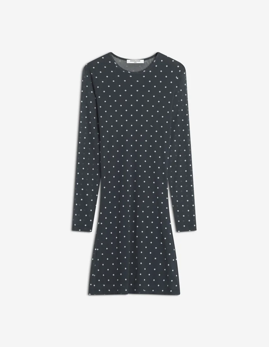 DETAILS Mesh mini dress with Polka Dot Fox print. - Transparent mesh mini dress - Black mesh body lining to avoid transparency - Mini length - Fitted fit - Crew neck - Long sleeves in transparent printed mesh - All-over Polka Dot Fox print PW01613KJ0122-O197 SIZE & CUT Cut: MINI Sizing: WOMEN The female model is 5.7 and is wearing size S MATERIAL 100% COTTON TRACEABILITY Made in Portugal