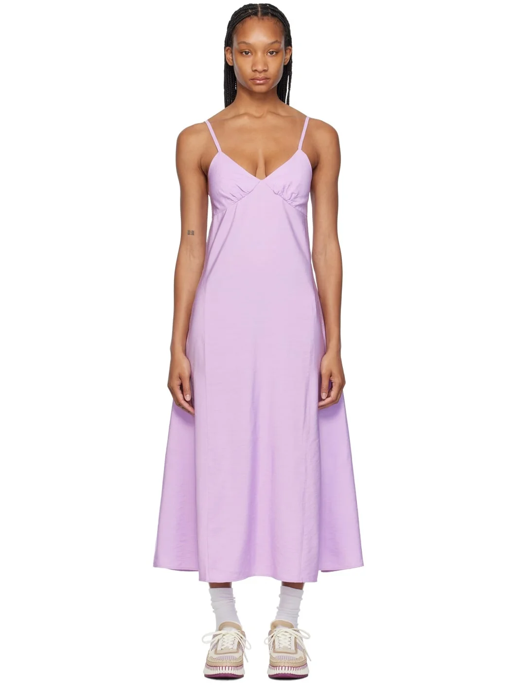 Viscose- and nylon-blend faille dress. · V-neck · Gathering at chest · Flared hem · Fixed spaghetti straps Supplier color: Lilac 89% viscose, 11% polyamide. Made in Bulgaria 241389F055003