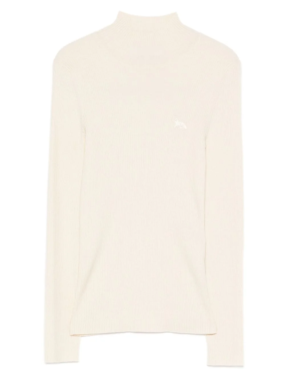 ribbed mock-neck top Highlights - Light cream - Ribbed knit - Mock neck - Long sleeves - Logo detail Imported Composition Wool 55%, Cotton 45% SIZE & FIT Model measurements Height 5 ft 9 in(1.76 m) Bust/Chest 31.88 in(81 cm) Hips 35.43 in(90 cm) Waist 24.8 in(63 cm) Washing instructions Hand Wash