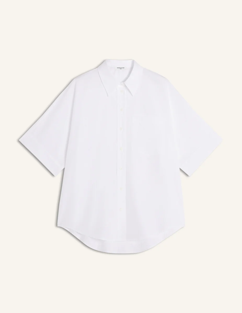 DETAILS Short sleeve shirt in cotton poplin. Maison Kitsune Paris woven label at the back neckline. - Cotton poplin shirt - Classic collar - Short sleeves - American button placket with Maison Kitsune engraved buttons - Patch pocket on the chest - Maison Kitsune Paris woven label at the back neckline QW00407WC0026-P100 SIZE & CUT Sizing: WOMEN The female model is 5.8 tall and wears a size S MATERIAL 100% COTTON TRACEABILITY Made in Portugal