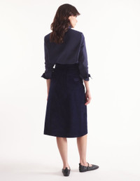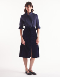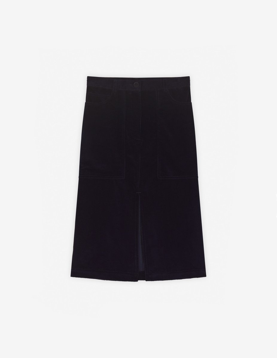 DETAILS Corduroy midi skirt with "Maison Kitsune Handwriting" signature embroidered on the back pocket. - Corduroy midi skirt - Below-the-knee length - Belt loops at the waistband - Button closure with hidden zipper - Five classic pocket - Front slit - Tonal embroidered "Maison Kitsune Handwriting" signature on the back pocket NW01505WW0116-P480 SIZE & CUT Cut: MIDI Sizing: WOMEN MATERIAL Main Material: 100% COTTON, Pocket lining: 100% COTTON TRACEABILITY Made in Bulgaria