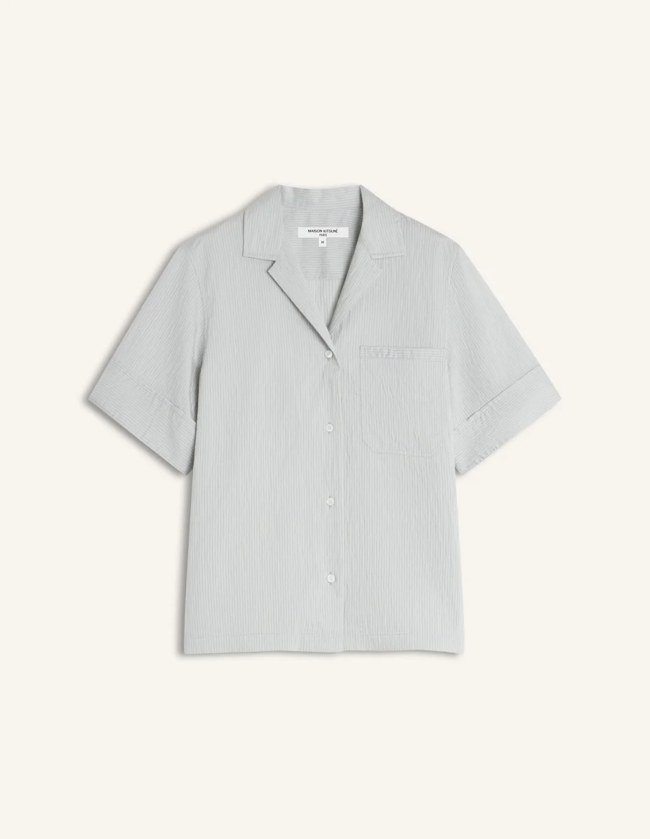 DETAILS Striped resort shirt in soft crinkled poplin. Maison Kitsune Handwriting embroidery at the back neckline. - Soft crinkled poplin resort shirt with textured stripes - Cuban collar - Short sleeves - Button closure with Maison Kitsune engraved buttons - Patch pocket on the chest - Maison Kitsune Handwriting embroidery at the back neckline QW00411WC5084-P181 SIZE & CUT Sizing: WOMEN The female model is 5.8 tall and wears a size S MATERIAL 80% MODAL, 17% POLYAMIDE, 3% POLYESTER TRACEABILITY Made in Portugal