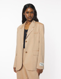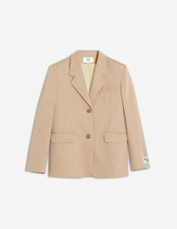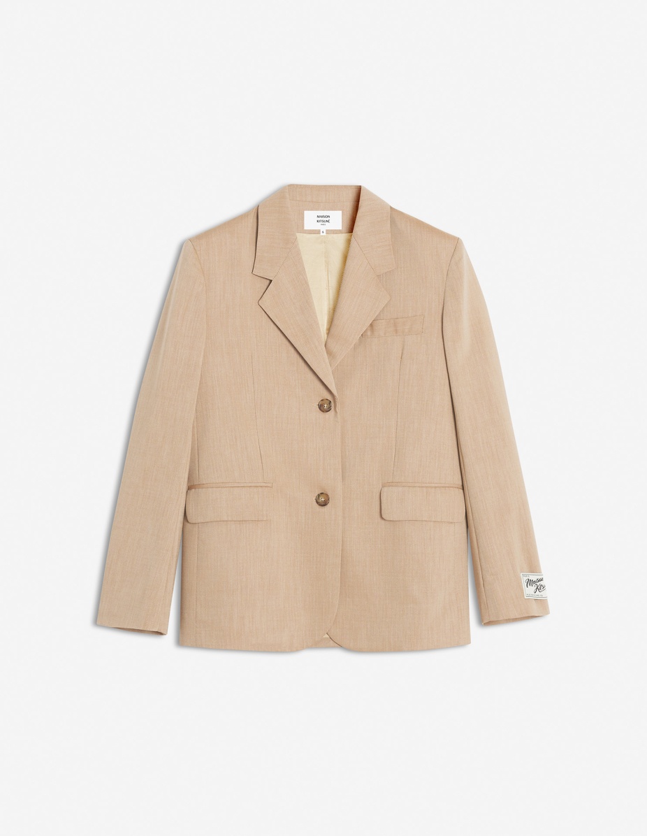 DETAILS Tailored jacket in cotton and wool. Relaxed cut with Maison Kitsune label. - Tailored jacket in cotton and wool - Relaxed fit - Tailored collar - Two-button closure - Chest pocket - Long sleeves finished off with straight button cuffs - “Maison Kitsune” label appliqueee on one of the cuffs - Two side welt pockets with flaps - Back vent - Interior welt pocket - Twill lining OW02129WT3006-0101 SIZE & CUT Cut: RELAXED Sizing: WOMEN The female model is 9.1 and is wearing size S MATERIAL Main Material: 38% VISCOSE, 62% WOOL, Lining: 49% COTTON, 51% VISCOSE TRACEABILITY Made in Romania