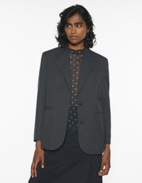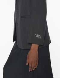 DETAILS Tailored pinstripes cotton and wool jacket. - Tailored jacket in cotton and wool with fine stripes - Fitted tailored fit with back vent - Two flap pockets and welt chest pocket - Closure with two Maison Kitsune engraved buttons - Fox Column woven label applied at the cuff, Profile fox chain at the inner neckline PW02121WT3022-H170 SIZE & CUT Cut: TAILORED Sizing: WOMEN The female model is 5.7 and is wearing size 36 MATERIAL Main Material: 74% COTTON, 2% POLYESTER, 24% WOOL, Body Lining: 49% COTTON, 51% VISCOSE, Sleeve lining: 60% ACETATE, 40% VISCOSE TRACEABILITY Made in Romania