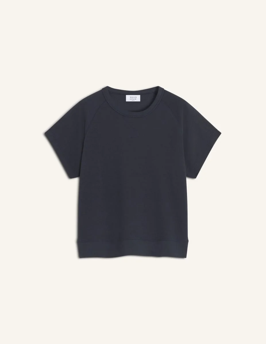 DETAILS T-shirt in textured jersey. Regular fit with Maison Kitsune Handwriting embroidery at the back neckline. - Textured terry jersey t-shirt - Regular fit - Crew neck - Raglan sleeves and V-stitch detail at the collar - Rib finishing at the collar - Maison Kitsune Handwriting embroidery at the back neckline QW00111KA0035-0413 SIZE & CUT Cut: REGULAR Sizing: WOMEN The female model is 5 tall and wears a size S MATERIAL 100% ORGANIC COTTON TRACEABILITY Made in Portugal