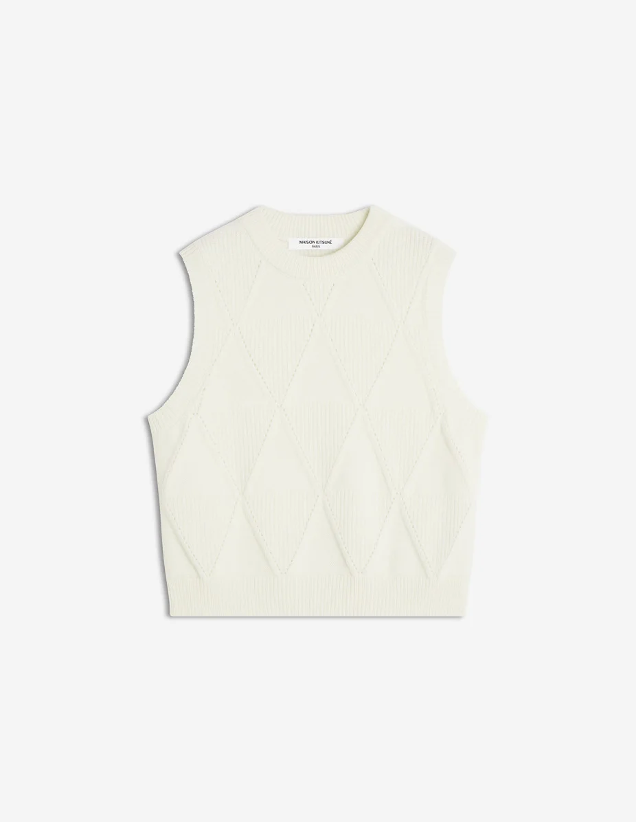 DETAILS Sleeveless wool vest with Argyle knitted pattern. Relaxed fit, Maison Kitsune Handwriting signature embroidery - Sleeveless wool jumper - Knitted Argyle pattern - Relaxed fit - Crew neck - Tonal Maison Kitsune Handwriting signature embroidered on the back PW00607KT1169-0382 SIZE & CUT Cut: RELAXED Sizing: WOMEN The female model is 5.7 and is wearing size S MATERIAL 100% WOOL TRACEABILITY Made in Bulgaria