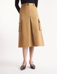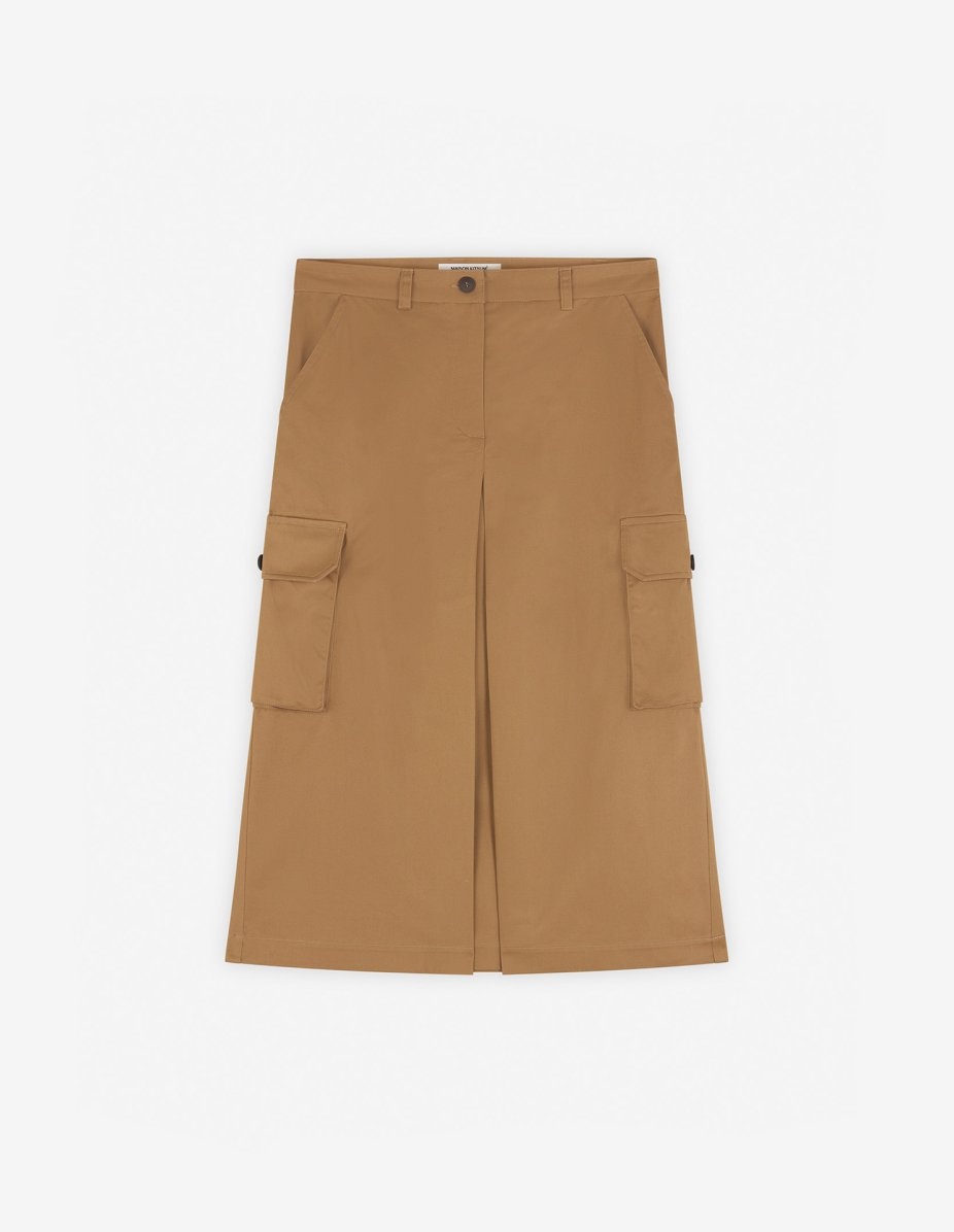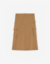 DETAILS Cotton gabardine cargo skirt. Midi length with pockets and "Maison Kitsune Handwriting" signature embroidered on the side pocket. - Cargo midi skirt in plain cotton gabardine - Below-the-knee length - Belt loops at the waistband - Button closure with hidden zipper - Two slash side pockets - Two gusset side pockets with button flaps - Tonal embroidered "Maison Kitsune Handwriting" signature on the pocket - Front slit NW01509WW0078-P245 SIZE & CUT Cut: MIDI Sizing: WOMEN MATERIAL Main Material: 100% COTTON, Pocket lining: 100% COTTON TRACEABILITY Made in Bulgaria