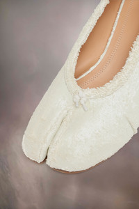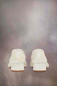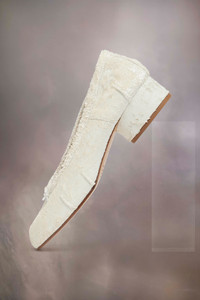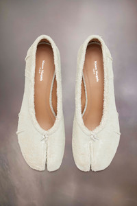 Maison Margiela presents the Tabi new ballerinas, which take their design from ballerina shoes in the house archives. With a 3cm heel, they are crafted from lasered suede for a distressed look, with used treatment applied at the folds, base and seams, manually worked by hand to create an artisanal vintage effect. Maison Margiela's signature stitch appears at the back; the opposite of a label. Product Details Item ID S58WZ0128P8159HA740 Upper: 100% Ovine Leather Lining: 100% Ovine Leather Inside: 100% Ovine Leather Contrast: 100% Ovine Leather Sole: 100% Calf Leather Contrast: 100% Rubber Heel height: 3 cm Ballerina shoes in micro laser cut nappa Tabi split toe Handmade leather folds Worn treatment Cotton knot at the front White stitching at the back Avoid rubbing, use of chemicals, and contact with dark-dyed garments Made in Italy