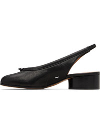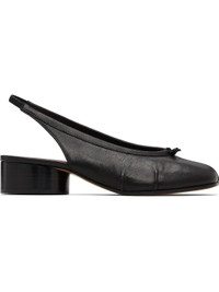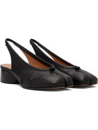Grained nappa calfskin heels. · Square cleft toe · Knotted accent at vamp · Partially elasticized slingback strap · White stitching at inner side · Hand-pleated detailing at sides · Buffed sheepskin lining · Stacked leather cylindrical heel with rubber injection · Calfskin sole · Heel: H1.25" Supplier color: Black Calfskin. Made in Italy 261168F122002