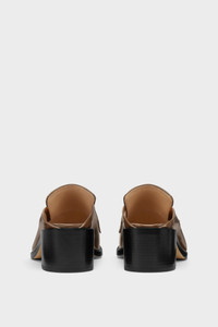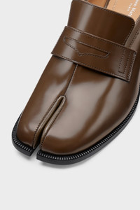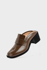 Crafted in polished calfskin for a sleek finish, these mules reinterpret the classic penny loafer – a staple of British city dressing – as a refined slip-on silhouette. They feature the Tabi split-toe, inspired by the traditional 15th century Japanese sock bearing the same name – launched for the Maison's debut collection in 1989. It captures the avant-garde and insubordinate spirit of the Maison and exists as a heritage classic, continually explored through each collection. Maison Margiela's signature single white stitch appears at the back. Product Details Item ID S58WP0289PS679T2158 Upper: 100% Calf Leather Lining: 100% Ovine Leather Inside: 100% Ovine Leather Contrast: 100% Calf Leather Sole: 100% Calf Leather Contrast: 100% Rubber Tabi penny loafer mules in calf leather Stacked Cuban heel Maison Margiela signature to the insole Made in Italy