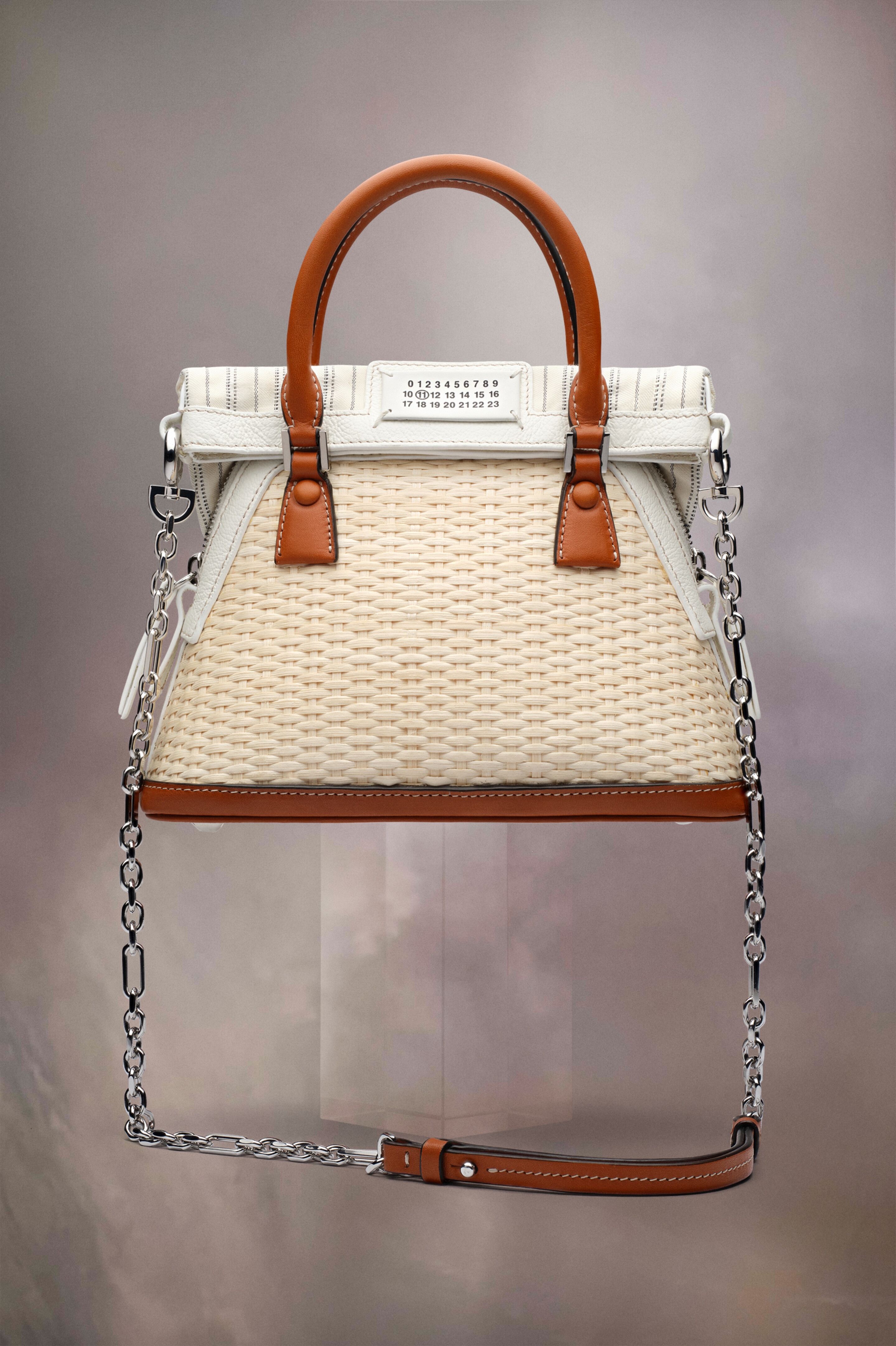 The 5AC classique micro, crafted from rattan and leather, features top handles and a chain shoulder strap. It is accented with the logo label on the inner. The iconic 5AC line takes its name from the French word 'sac' (bag). It explores the Maison's Anonymity of the lining concept. The bag's metal rivets are covered in leather by hand, with the metal visible only where needed, for a clean aspect. Artisanal details include the bag's exposed edges hand-painted in tone with the leather.