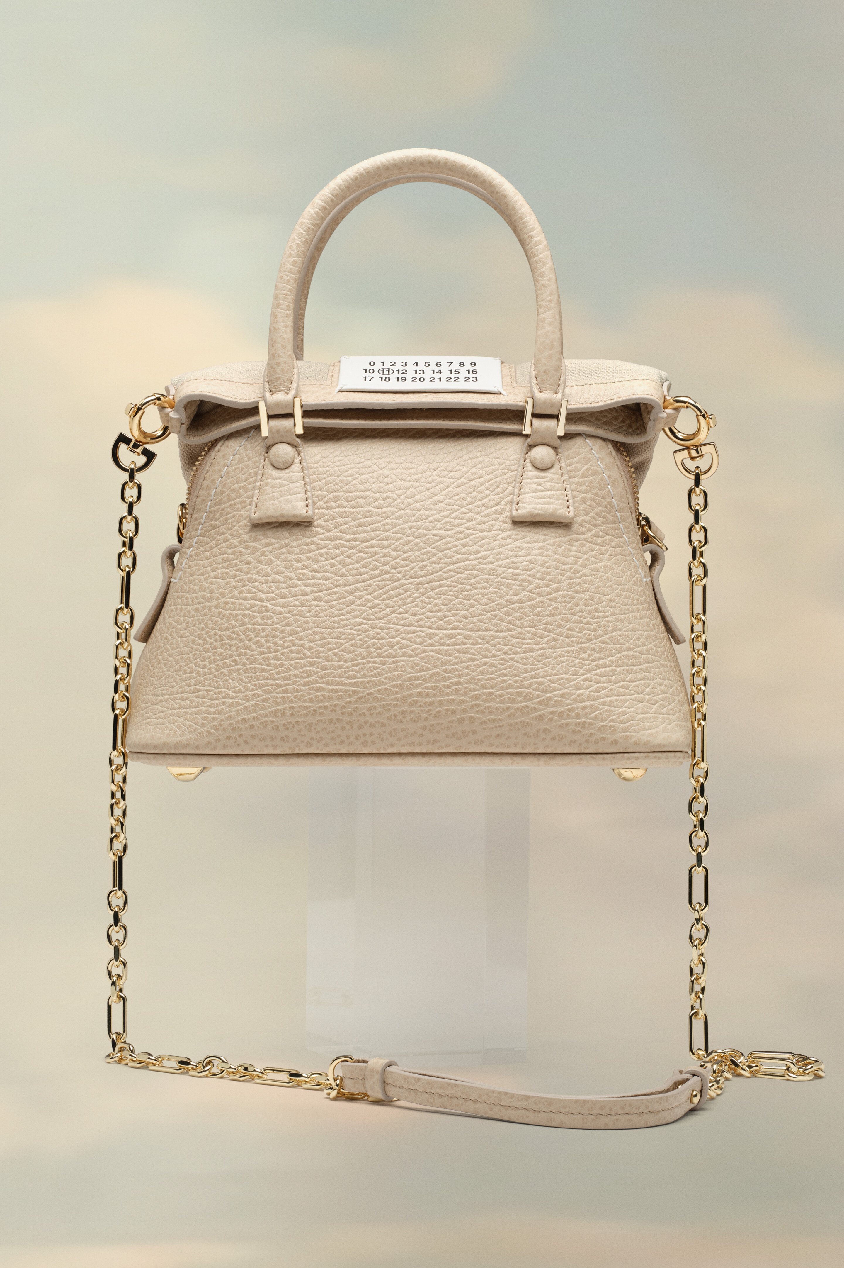 The 5AC classique micro, crafted from grainy leather, features top handles and a chain shoulder strap. It is accented with the logo label at the front. The iconic 5AC line takes its name from the French word 'sac' (bag). It explores the Maison's Anonymity of the lining concept. The bag's metal rivets are covered in leather by hand, with the metal visible only where needed, for a clean aspect. Artisanal details include the bag's exposed edges hand-painted in tone with the leather.