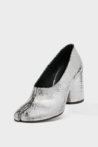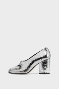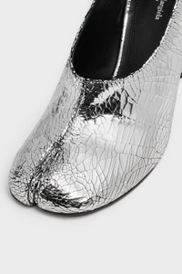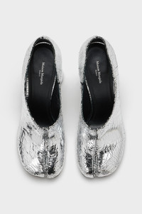 Crafted from soft nappa leather, this Tabi decollete pump in Broken Mirror finish rests on a cylindrical heel, merging refinement with subversive design. They feature the Tabi split-toe, inspired by the traditional 15th century Japanese sock bearing the same name – launched for the Maison's debut collection in 1989. It captures the avant-garde and insubordinate spirit of the Maison and exists as a heritage classic, continually explored through each collection. Maison Margiela's signature single white stitch appears at the back. Product Details Item ID S58WL0311P5016T9002 Upper: 100% calf leather Lining: 100% ovine leather Inside: 100% ovine leather Sole: 100% calf leather Contrast: 100% calf leather Contrast: 100% rubber Broken mirror calf leather Cylindrical heel Tabi split toe Four stitches at the back Avoid contact with water, chemical product, prolonged exposure to heat sources. The sole can be cleaned with a damp cloth and neutral soap Made in Italy